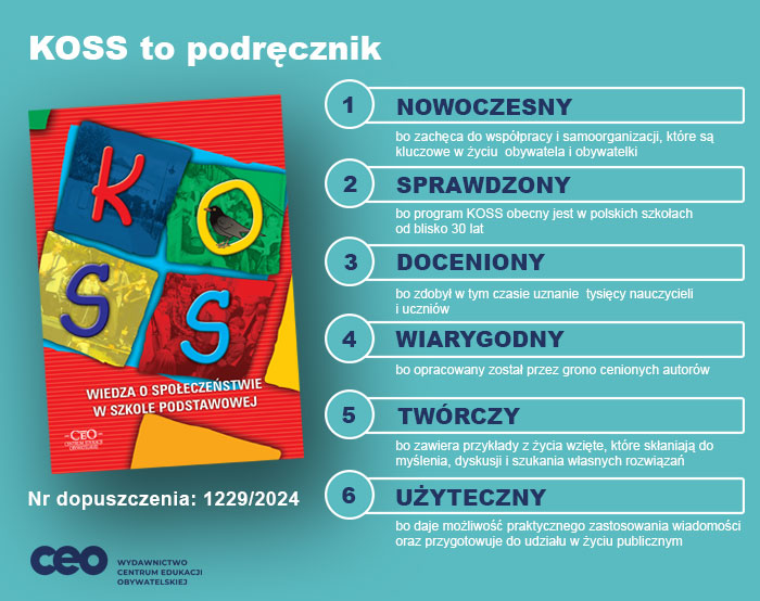 Chcemy polecić Wam nasz podręcznik KOSS. Wiedza o społeczeństwie w szkole podstawowej pod redakcją Alicji Pacewicz i Tomasza Merty (nr dopuszczenia 1229/2024). Co go wyróżnia od innych? Połączenie nowoczesności i użyteczności, oryginalna prezentacja wiadomości i żywy język, twórcze podejście do przedmiotu oraz dobrze dobrane ćwiczenia i zadania. Przykłady z życia wzięte inspirują do myślenia, a ważne problemy skłaniają do dyskusji i szukania rozwiązań. Wszystko to sprawia, że lekcje są inne od zwykłych, ciekawsze i bardziej wartościowe, a przecież o to chodzi. Warto więc dołożyć wszelkich starań, by wiedza szkolna stała się podstawą do podejmowania działań na rzecz szkoły, społeczności lokalnej, całego kraju.
